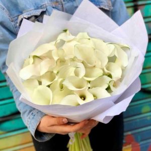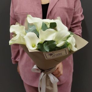 Букет из 9 белых калл с эвкалиптом в упаковке “Весенний туман”