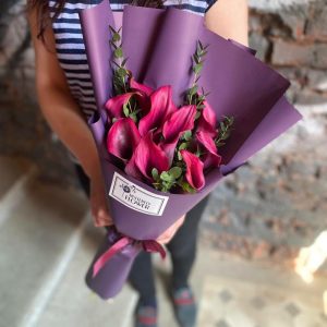 Букет из 9 черных калл с эвкалиптом в упаковке “Агостина”