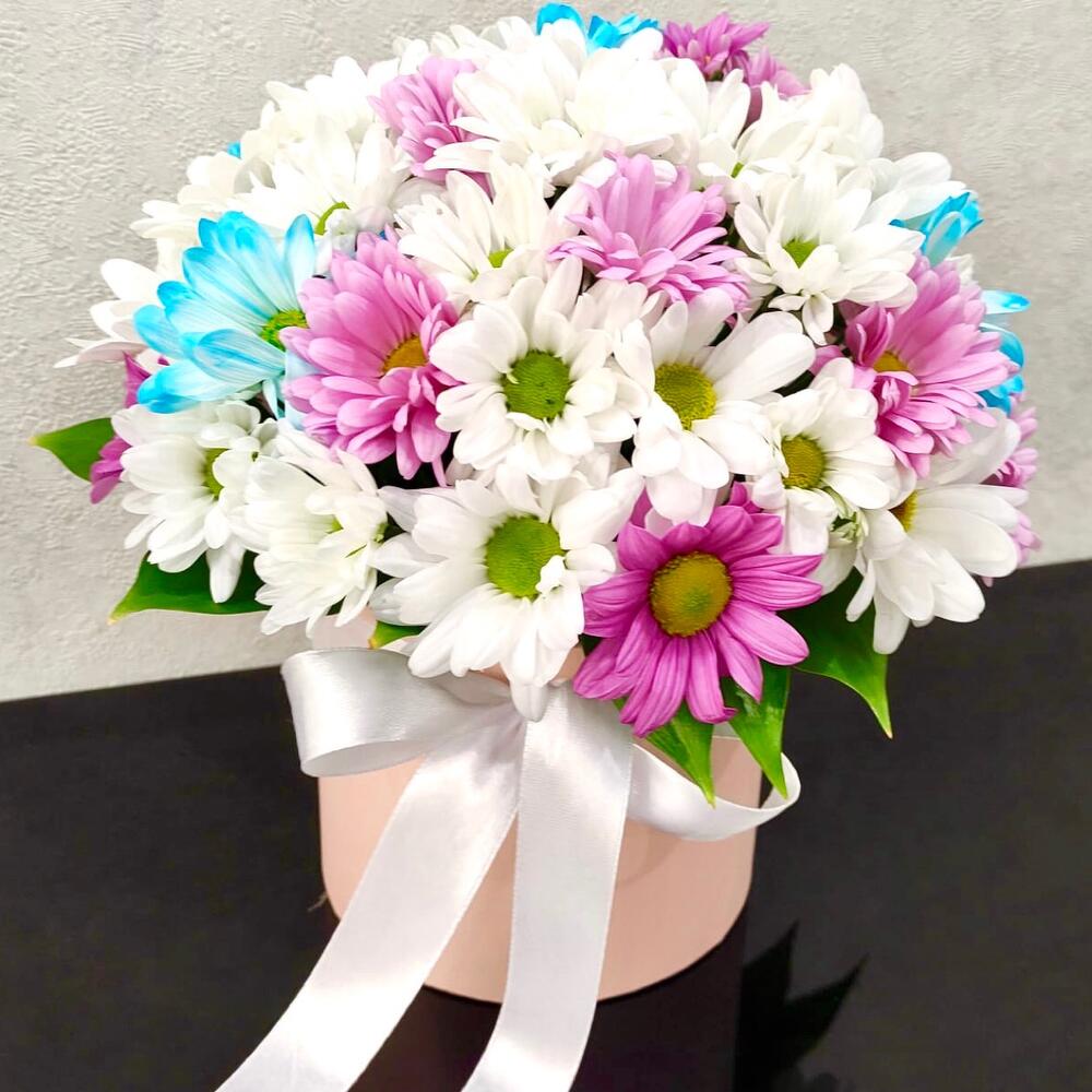 Яркая цветочная композиция из ромашковой хризантемы придает букету особую свежесть и изысканный шарм.