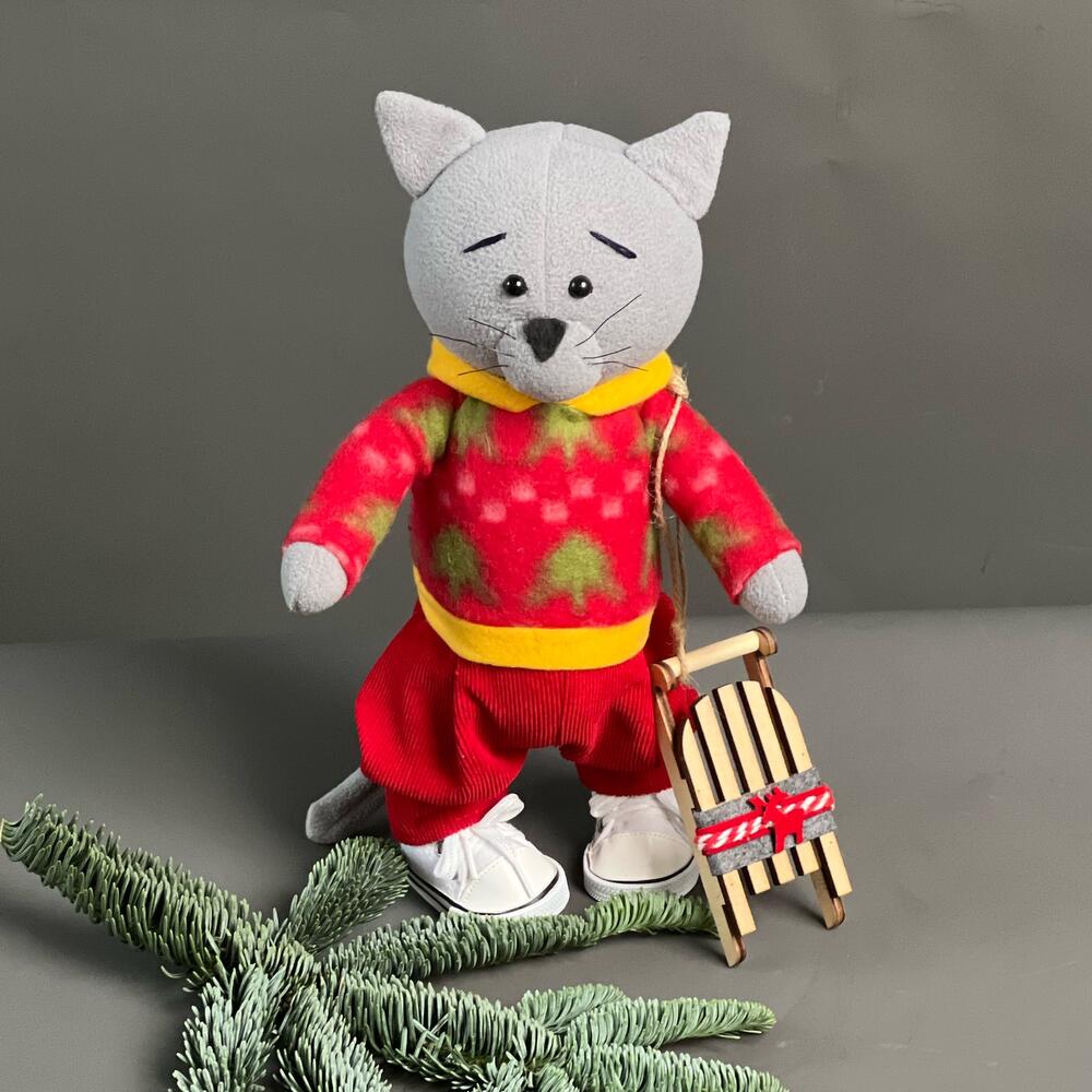 Модный кот с деревянными санками! Игрушка ручной работы, выполнено качественно и современно. Отличный подарок для ценителей кропотливого ручного труда и уюта. Отлично впишется в предпраздничную суету в любом доме) порадуйте близких с заботливым котиком!